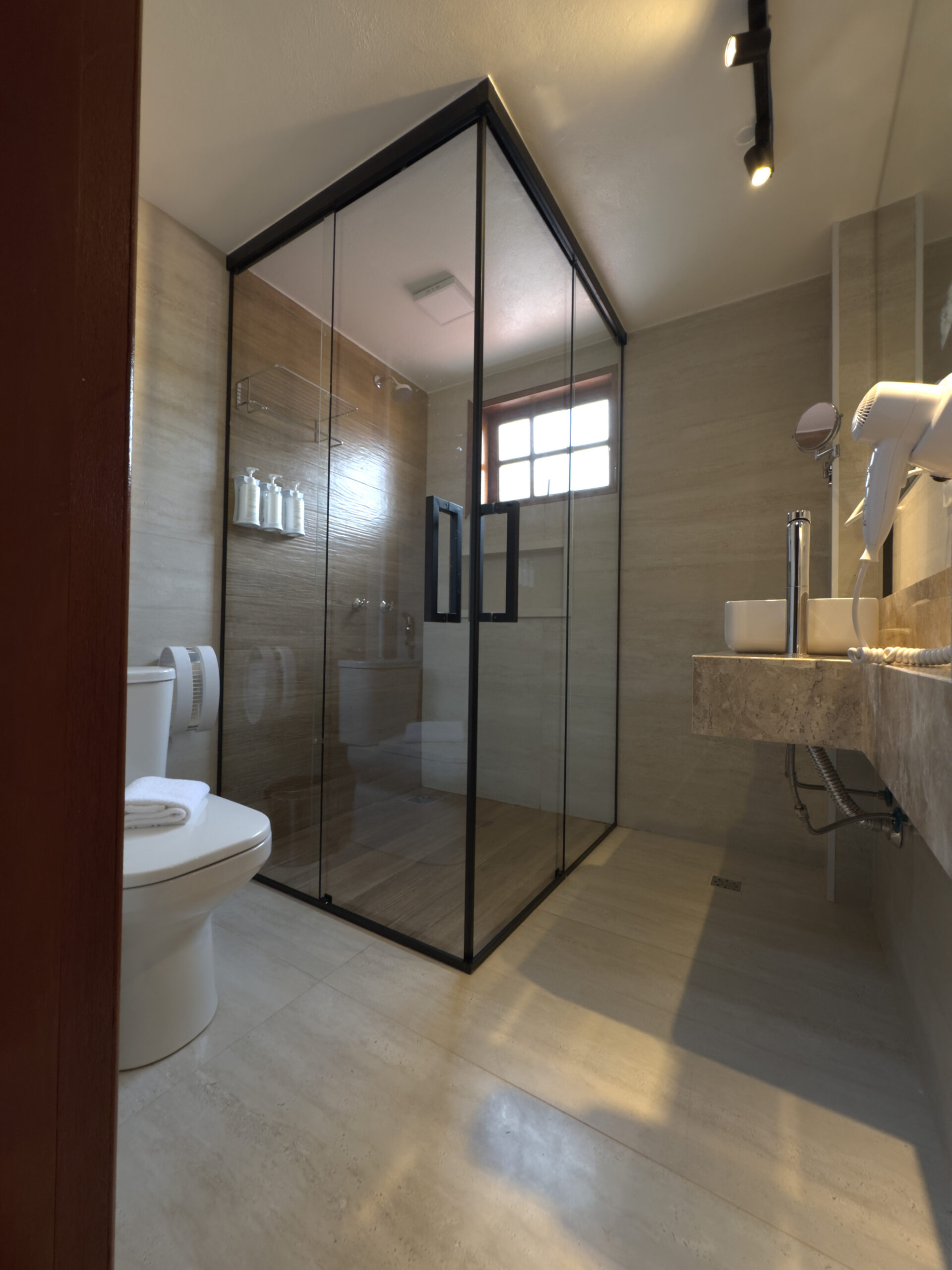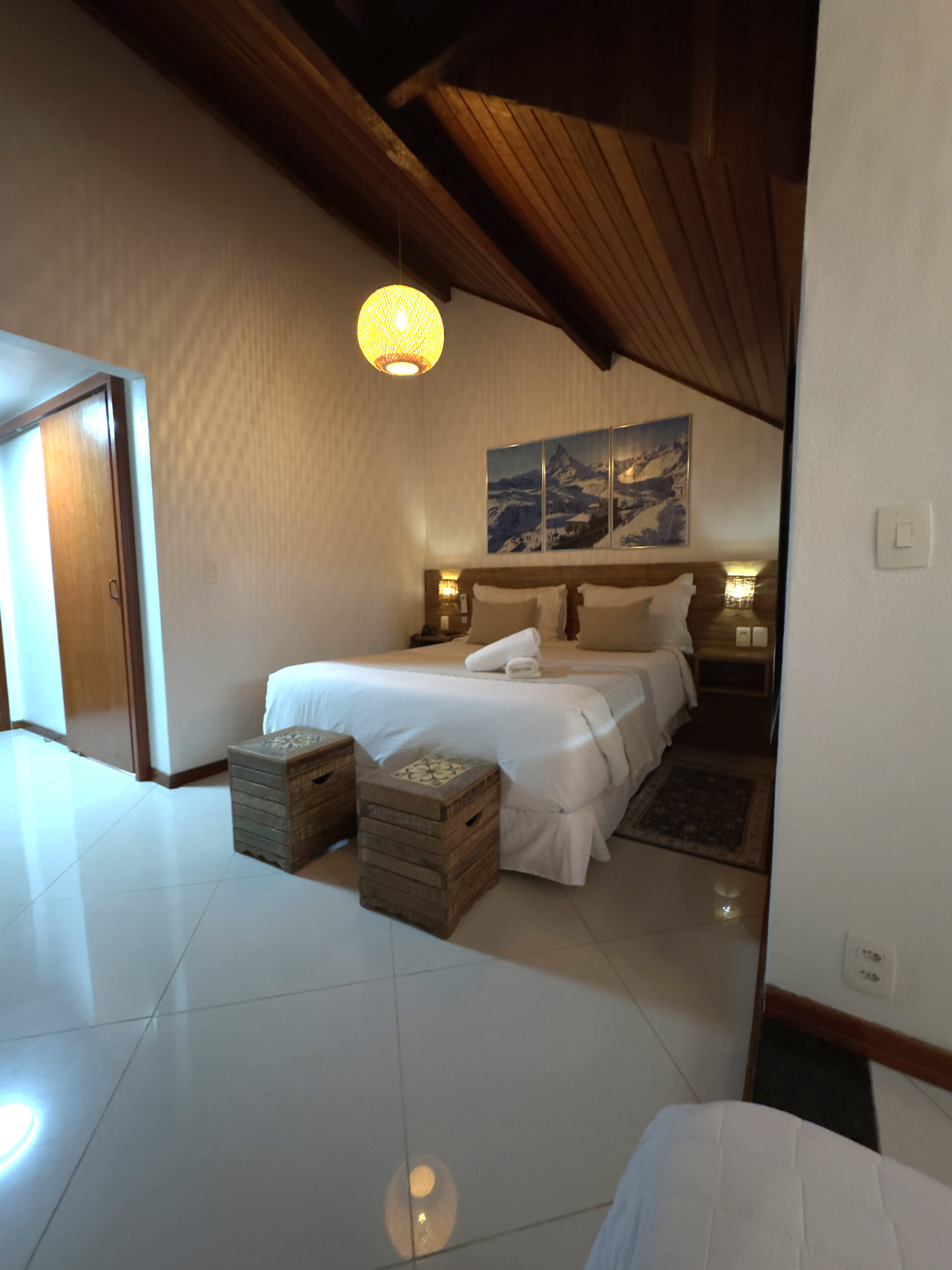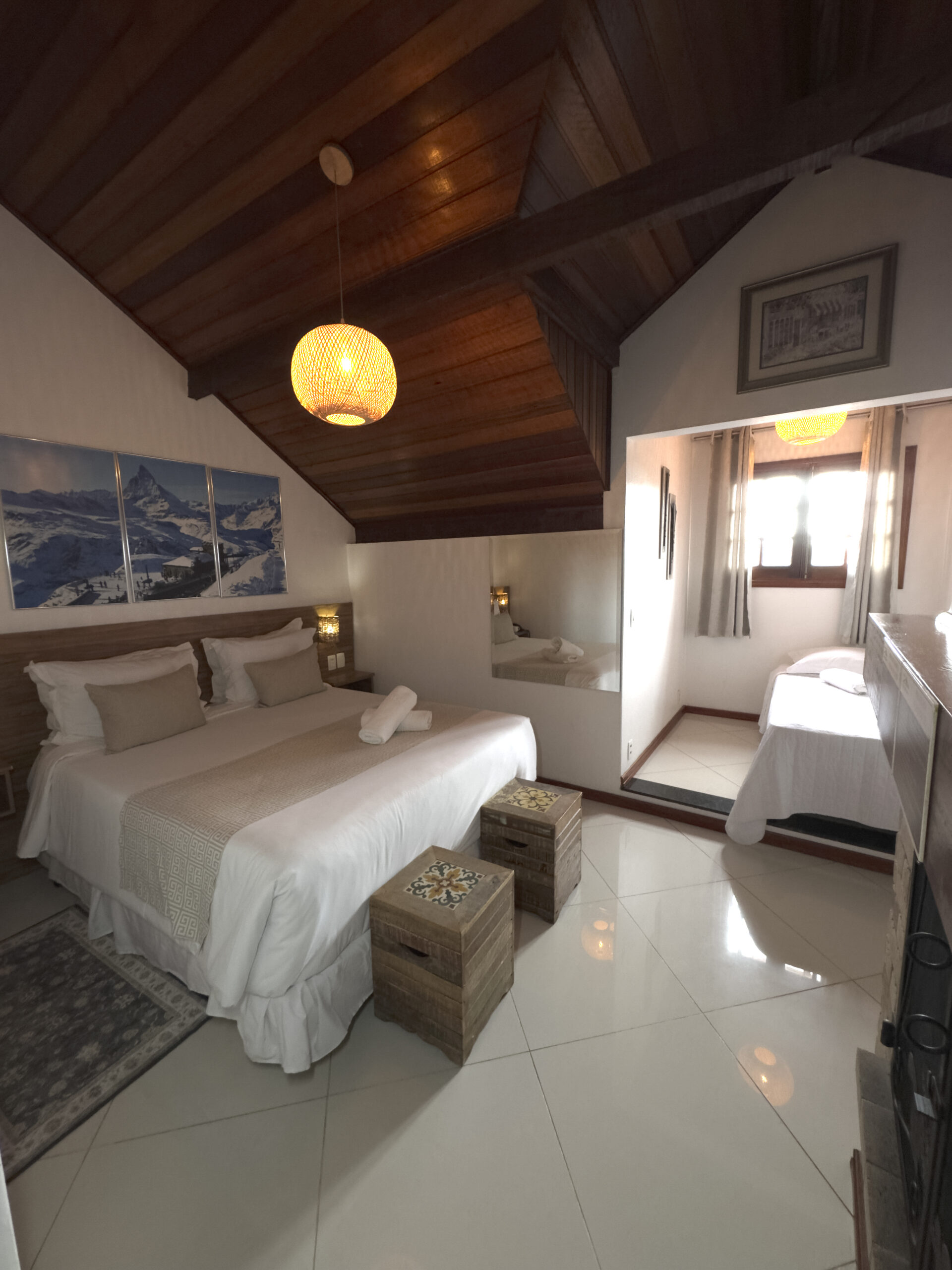 Suíte com 30m²Localizada no primeiro andar do CasarãoPossui uma saleta com vista para a Mata integrada ao quartoLareira Cama queen com colchão com 36cm de alturaBanheiro privativo, com aquecimento individual a gásSmart TVAcesso por escadas