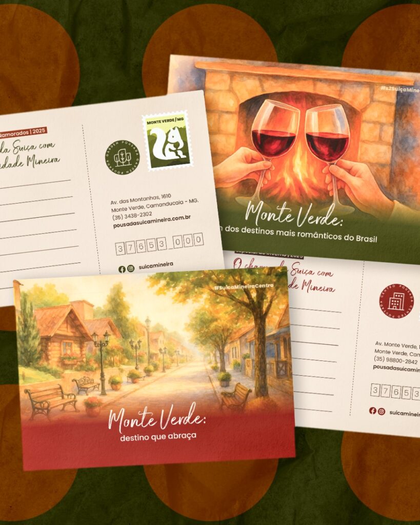 Sim, as Pousadas Suiça Mineira apresentam uma novidade cheia de charme para os hóspedes e apaixonados por Monte Verde: postais ilustrados, com cenas que representam a beleza da vila, o aconchego das pousadas e a essência da nossa história.