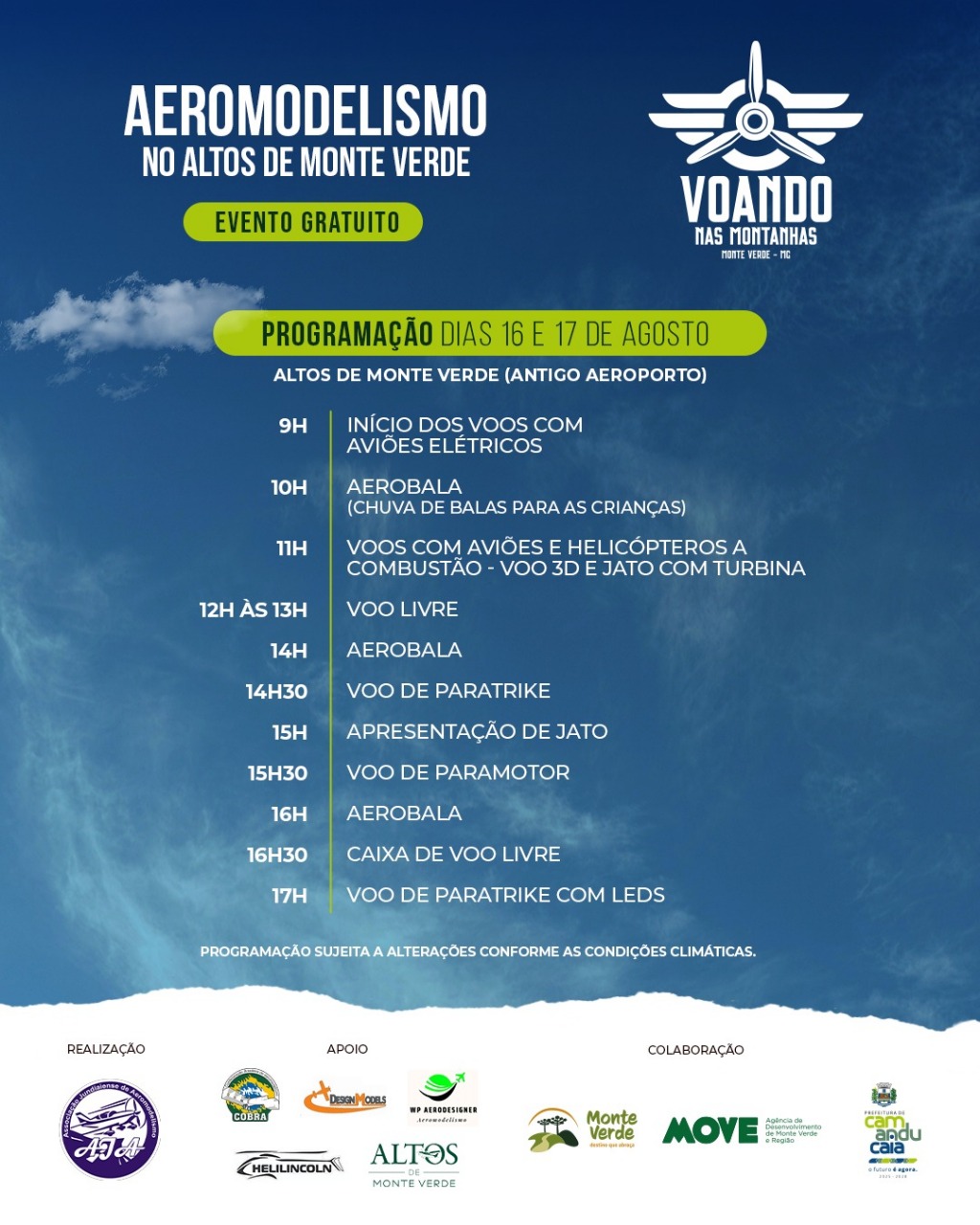 O evento acontece no Altos de Monte Verde (antigo aeroporto) e reúne aviões elétricos, helicópteros, jatos com turbina, além de modalidades como paratrike, paramotor e voo livre. Um verdadeiro show aéreo em miniatura, com manobras ousadas e muito entretenimento.
